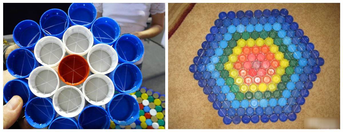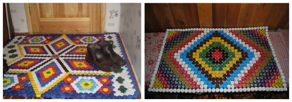 Сделать эксклюзивный ковер довольно просто. Необходимо насобирать много крышек разных цветов. Соединяются крышки меж собой леской, а дырочки делаются при помощи обычного шила. Дабы легче было делать дырочки, шило можно разогревать. Расцветка и форма коврика зависит только от вашей фантазии.