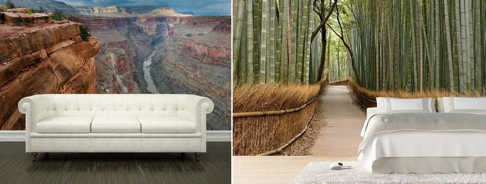 панорамные фотообои. Это могут быть изображения крупных городов, широких балконов или окон, природные пейзажи;