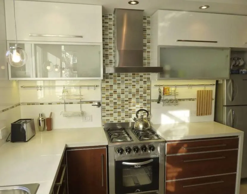 Еще один экономически эффективный и практичный способ обновить старую кухню – это приклеить стекло на часть стены между верхними и нижними шкафчиками.
