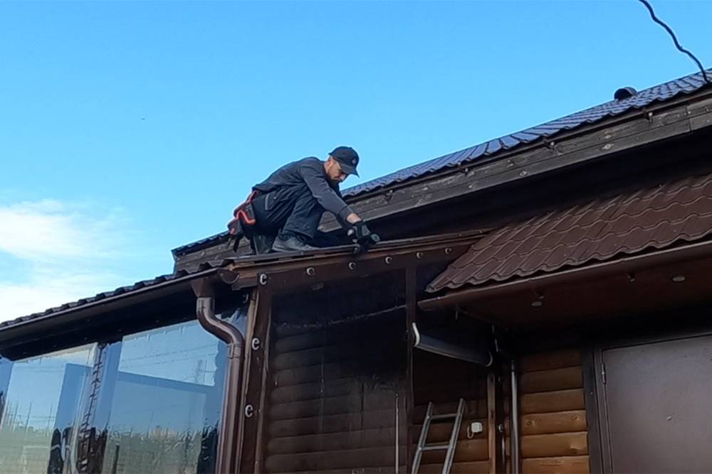 Сначала разложил листы на земле и замерил длину, потом соотнес ее с длиной крыши, чтобы понять, какой нахлест сделать. Потом временно закрепил каждый лист на пару саморезов, а когда убедился, что все сошлось и стоит ровно, закрепил кровлю окончательно.