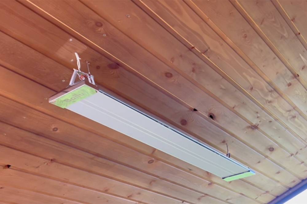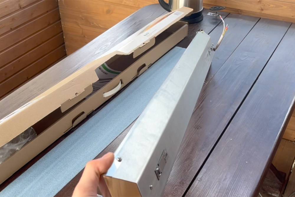Так как мягкие окна позволяли закрыть веранду целиком, пусть и не полностью герметично, я решил поставить обогреватель. Выбрал потолочную инфракрасную панель. Опыта применения таких панелей у меня нет, но я посмотрел видео, почитал отзывы и понял, что этот вариант лучше всего подходит. ИК-обогреватели нагревают поверхности, то есть, например, стол, стулья и стены, а уже от них прогревается воздух.