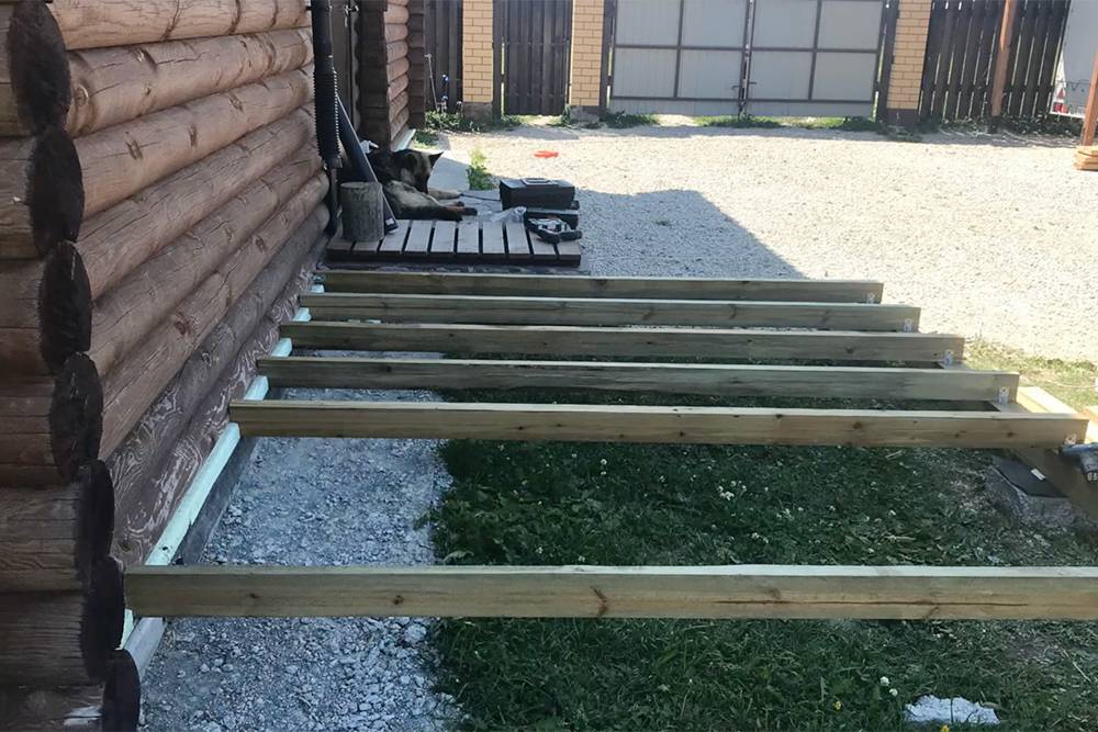 Лаги сделал длиной 2,5 м, одной стороной уложил их на фундамент дома, второй — на опорный брус. Сначала поставил крайние лаги, промерил рулеткой, чтобы получился ровный прямоугольник. Затем смонтировал все остальные опоры.