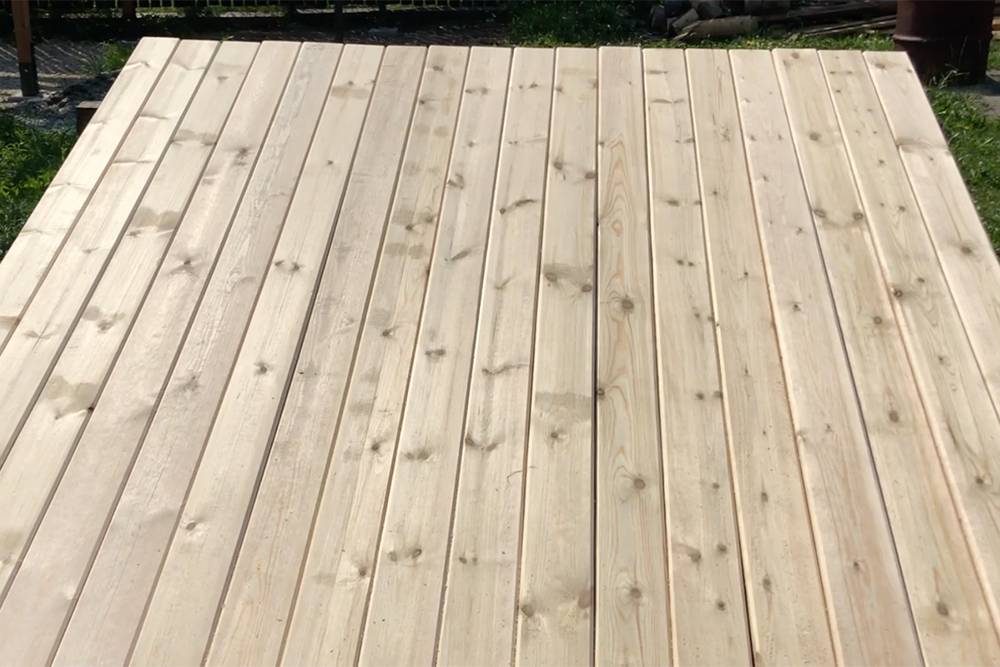Края доски по отрезу обработайте наждачной бумагой и покройте террасным маслом. На этом строительство террасы своими руками практически завершено.