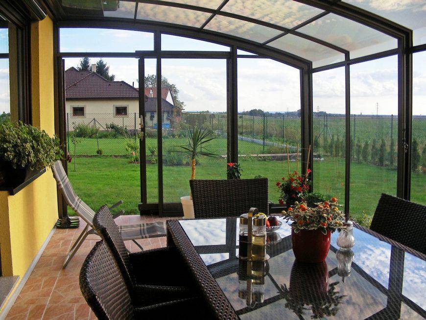- Остекление. Может быть постоянным или сезонным. Оконные элементы чаще всего размещаются по всему периметру. Для панорамного остекления используют обычные оконные блоки и стеклопакеты (как с пластмассовым, так и с деревянным профилем). Веранда с большой площадью остекления обеспечивает отличную внутреннюю инсоляцию (поступление солнечного света). Для защиты от солнечных лучей используют шторы, жалюзи, ставни и экраны.
