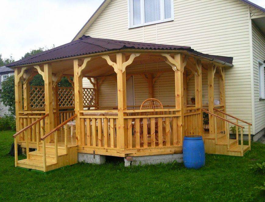 - площадку делают просторной, чтобы вместить всех отдыхающих. По некоторым параметрам беседка схожа с террасой — обе конструкции могут быть построены отдельно от дома. Разница между ними заключается в том, что первая обязательно имеет ограждение в виде перил или небольших стенок; у второй же этот элемент, как и кровля, является опциональным.