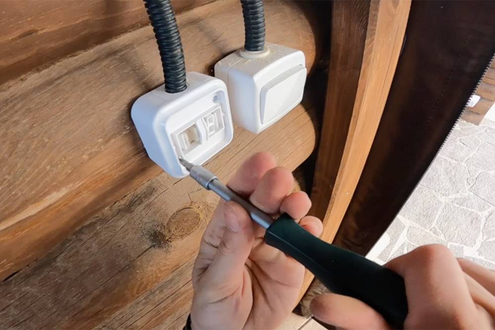 Когда соединил провода в коробке, просверлил дополнительное отверстие в вагонке, вытащил кабель вниз и поставил одноклавишный выключатель — просто соединил фазный провод через выключатель.