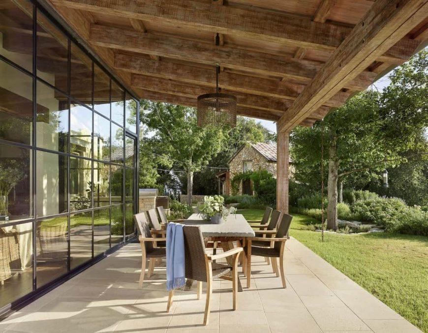 Также возможен вариант примыкающей к дому террасы с навесом, предусматривающий условное ограждение. Это может быть живая изгородь, невысокая ограда или другая подобная конструкция.