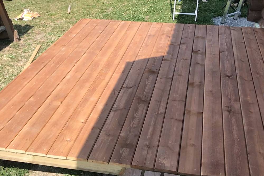 Перед работой с лагами и террасной доской, то есть перед их установкой, необходимо провести их обработку тем составом, который вы выбрали. Мы остановились на специальном масле для террас австрийской компании Adler, о чём не пожалели. Масло для террас бывает разных цветов, так что вы без труда можете выбрать нужный цвет для вашей террасы.