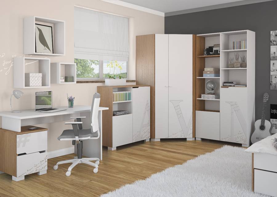 Комната для девушки, выполненная во французском стиле, должна быть оформлена в пастельных тонах. Скандинавский стиль предусматривает минимальный набор мебели, выполненной в насыщенных, сочных тонах. При этом все изделия для молодежной комнаты должны быть выполнены из дерева и гармонично сочетаться со спокойным оформлением стен. Предпочтение отдается аккуратным комодам и тумбам. Для хранения книг и мелких вещей на стене располагают стеллаж. Полноценное оформление поддержит наличие вдоль стен коробок различных размеров желтого, черного или коричневого цветов, предназначенных для хранения белья и туалетных принадлежностей.