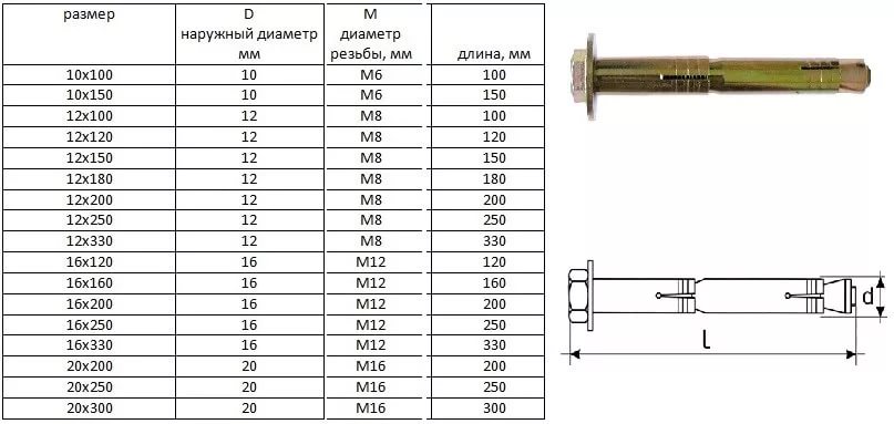 | Это наиболее популярный вид анкера по бетону. Длина болта колеблется от 20 мм до 120 мм, а диаметр от 4 мм до 20 мм. В составе конструкции втулка с внутренней резьбой, проходящая по длине стержня. Имеющаяся на ней головка, распирает втулку. Такое простое устройство, надежно фиксирует крепеж. При установке требуется предварительно просверлить в бетоне отверстие, как и для клинового болта. |