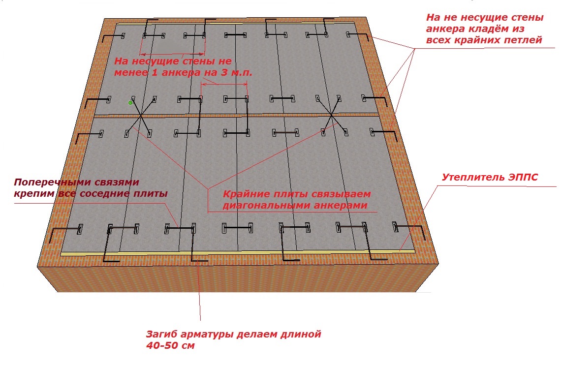 Анкеровка и заделка стыков между плитами цементно-песчаным раствором М100 создают жесткий диск, которые превращают здание в пространственно неизменяемую систему. Анкеры располагают через плиту, но не более 3 метров друг от друга.