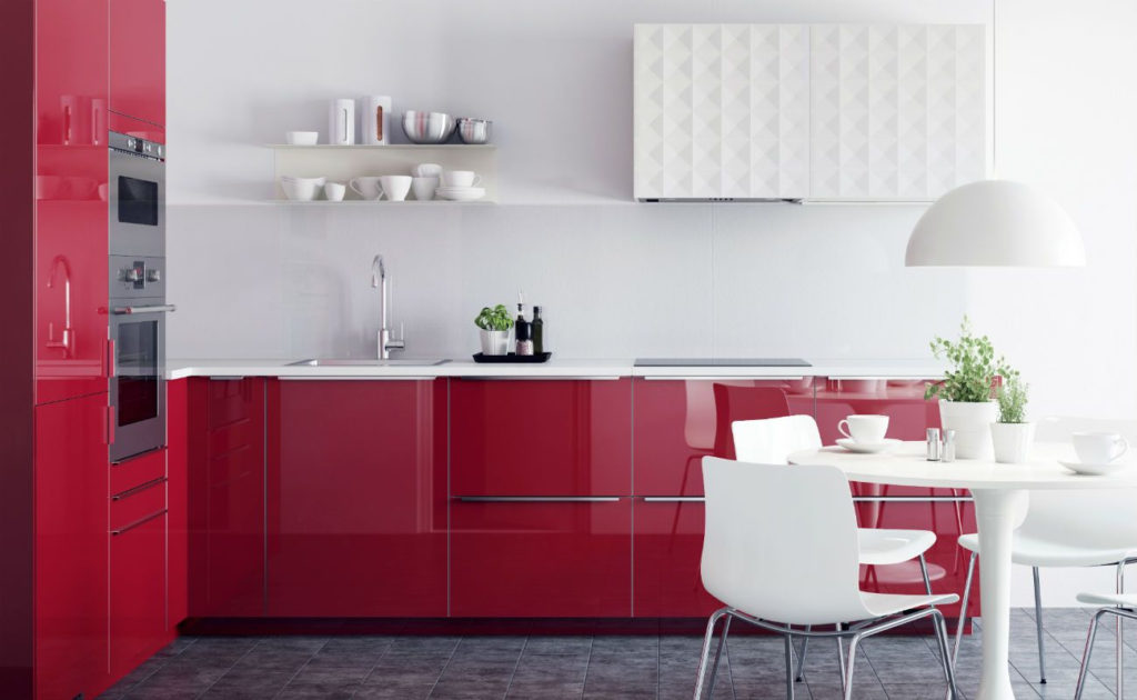Современные интерьеры оформляются во всех цветах, начиная от белоснежного и заканчивая цветом воронова крыла, причем особый шик и блеск придают комнате глянцевые поверхности. Наиболее популярными на сегодняшний день считаются кухни бордового, красного, кораллового, оранжевого, желтого цветов. Их начинают догонять и гарнитуры фиолетовых оттенков, которые прекрасно сочетаются с нейтральными оттенками (белый, бледно-серый, золотистый) и с фисташковым.