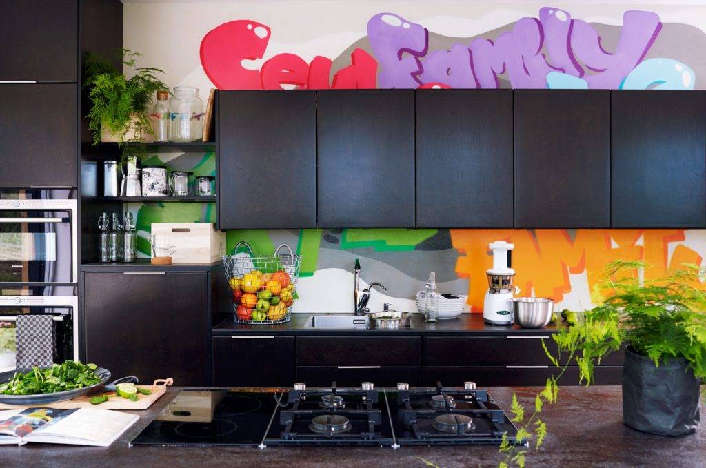 Но, главный декоративный элемент тут не они, вовсе. Акцент сделан на ярких стенах абстрактной расцветки и шторах, которые были бы больше уместны в столовой, нежели в помещении для приготовления пищи.