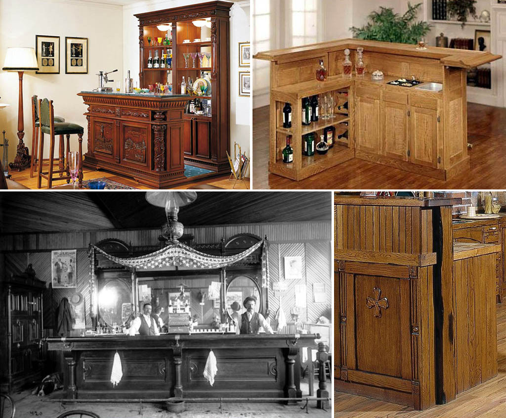 Ввиду физической крепости, буйства и драчливости посетителей барная стойка для салуна требовалась тоже крепкая, да еще и приходилось дополнять ее поручнем и подножием из труб. Стульев к стойке салуна не полагалось и вообще типичный салун Дикого Запада был просто сараем с коновязью, где единственно приличной мебелью и его лицом являлась барная стойка; слева внизу на рис. – скан подлинного фото интерьера салуна 1880-х – 1890-х, а что показывают в вестернах, то показывают в вестернах. Именно в салунах стойка бара впервые стала самым значащим предметом мебели и символом престижа.
