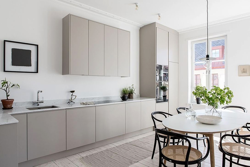 Кухня в серо-белых тонах дополняется стеклянными элементами декора. Вставки в дверцы шкафов гарнитура добавят объема и воздуха, визуально облегчат интерьер. Стеклянная столешница обеденного стола выглядит легко, воздушно, поддержит визуальную чистоту и свежесть.
