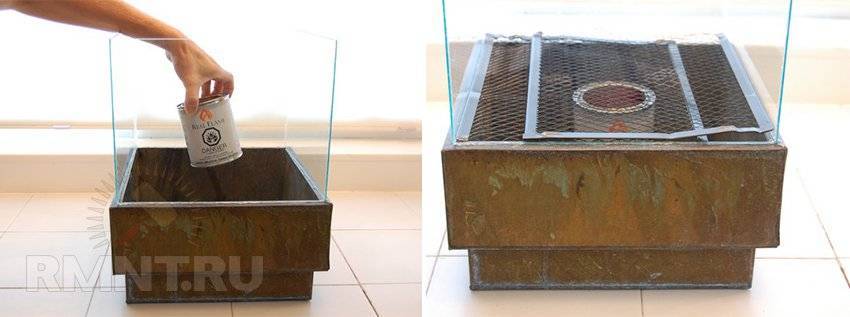 - Сборка конструкции: в основание вставляется топливный бак с горючим, помещается в него фитиль, который продевается через решетку. Камин можно уже использовать! Осталось только украсить изделие, выложить внутри красивые камни.