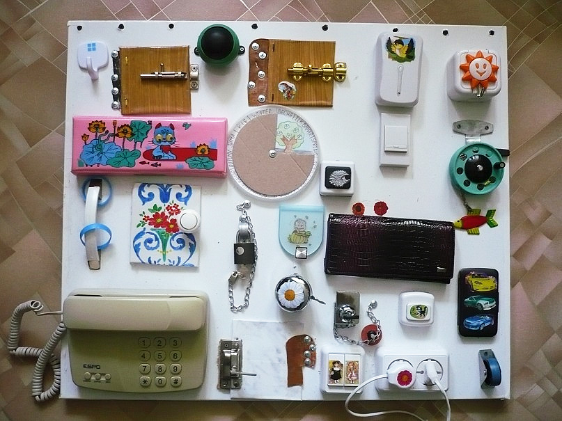 С целью обучения доска дополняется фигурками с базовыми цветами, различными формами, картинками с животными. Оптимально укомплектовать бизиборд игрушками типа лабиринта, их можно купить готовыми или изготовить собственными руками.