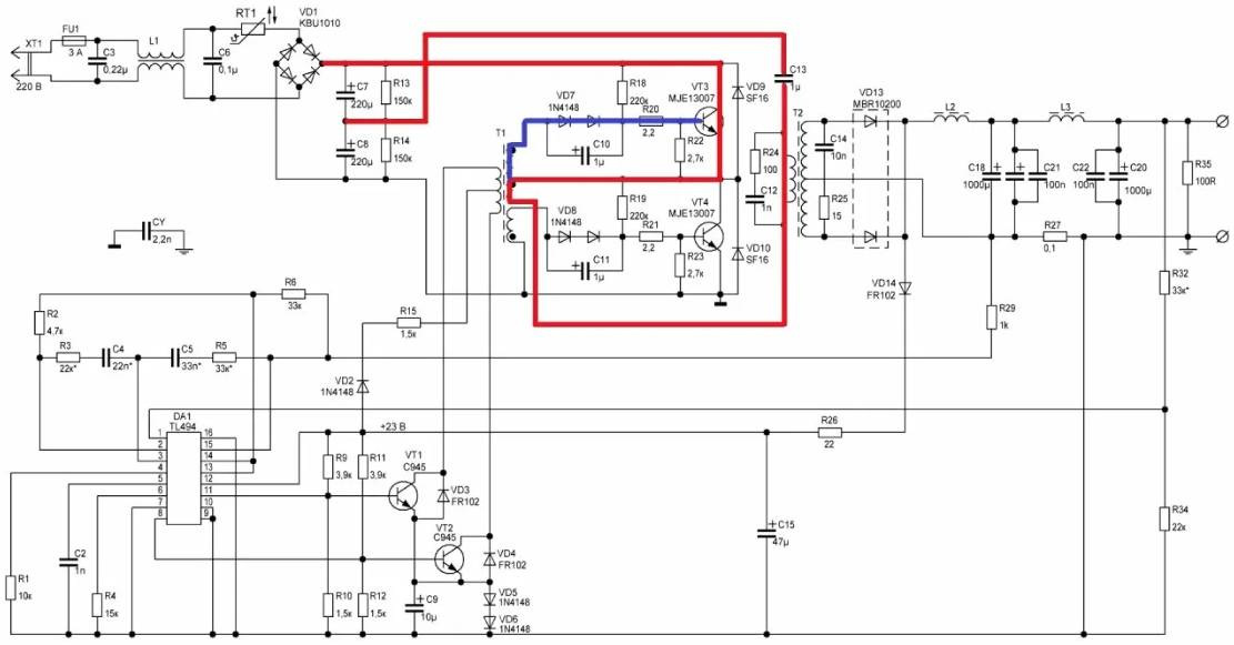 Затем сравнивают результат с аналогичным показателем зарядки заведомо исправного такого же конденсатора. Если в высоковольтной части БП напряжение имеется, но на выходе его нет — причину неисправности ищут в низковольтном выпрямителе или его LC-фильтре.