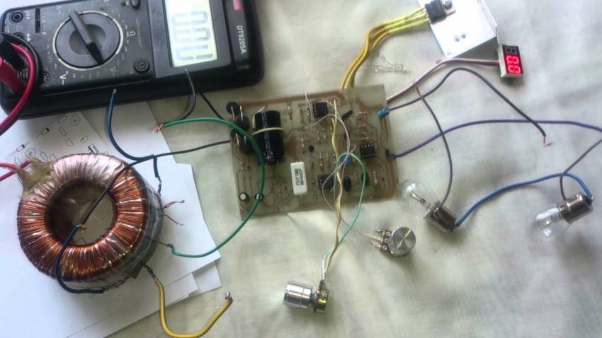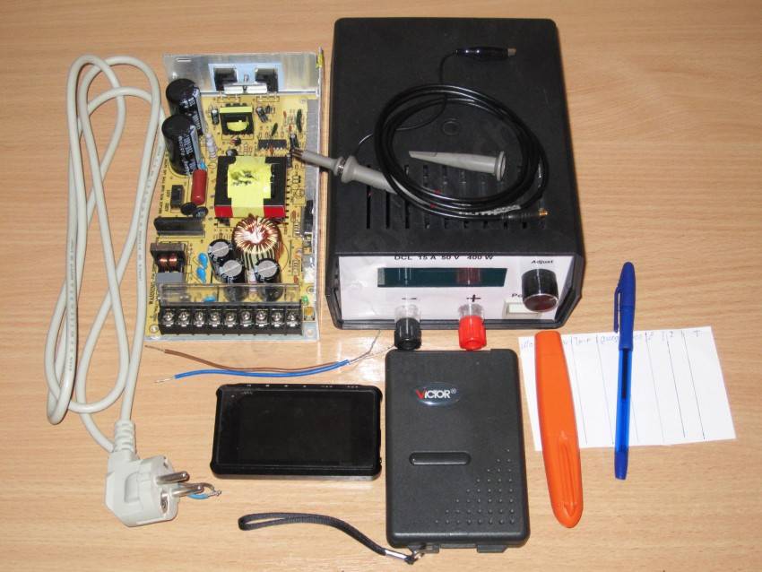 Подачей напряжения с источника питания проверяется работоспособность шим-контроллера, частота преобразования, наличие управляющих импульсов на обоих выходах. Если все в порядке, то подключается второй источник питания, который будет имитировать сетевой вольтаж.