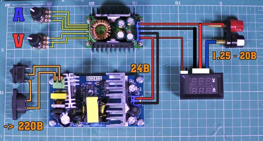 - для контроля напряжения на выходе устанавливают цифровой вольтамперметр, с интервалом измерений от 1,5 до 30 В.