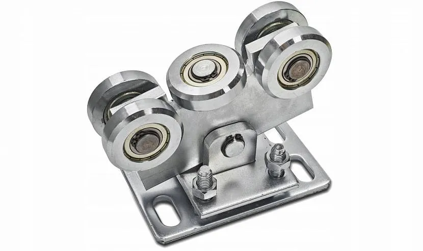 Устанавливаются сверху и снизу рамы. Верхний ролик удерживает створку в горизонтальном положении, и предотвращает раскачивание полотна. Нижний опорный – монтируется в торце консоли (балки). Опорные ролики отвечают за удерживание створки в закрытом положении. А также, за предотвращение ее провисания и самопроизвольного открытия. Ролики жестко фиксируются на фундаменте.