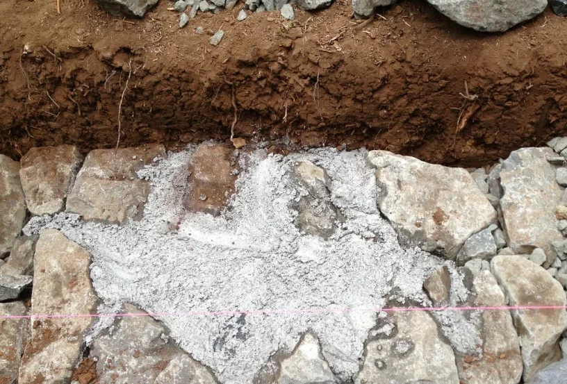 Не требуется размерная сортировка материала, укладываемого в траншею. Однако, перед укладкой в заливочную площадь, по днищу проходят песком, щебневой массой. Обсыпку уплотняют (обтаптывая), после, помещают камень.