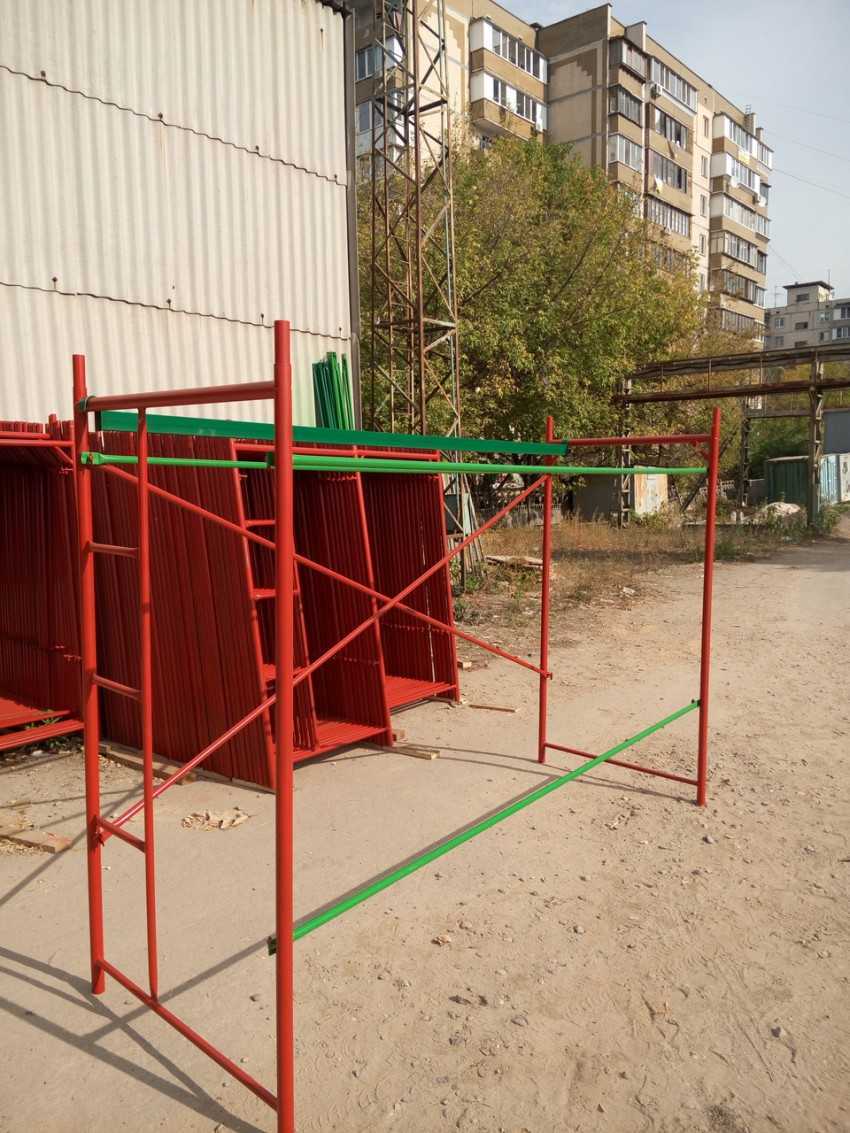 Рамные. Из круглой или прямоугольной трубы свариваются рамы одинакового размера. Соединяются они между собой поперечными трубами и укосинами. Имеют модульное строение, легко наращиваются как в высоту, так и в длину. Имеют определенный шаг по длине — 1,5/2/2,5/3 метра, по высоте одна секция обычно составляет 2 метра, стандартная глубина — 1 м. В некоторых рамах предусмотрены колеса — для более легкого передвижения по ровной поверхности. Соединение элементов флажкового типа — на раме приварены штифты с прорезью, в которую вставляется флажок. В поперечинах и укосах сделаны отверстия. Элементы надеваются на штырь, фиксируются при помощи флажка. Наращиваются вверх секции при помощи соединительных труб меньшего диаметра, приваренных к стойкам рам с одной стороны