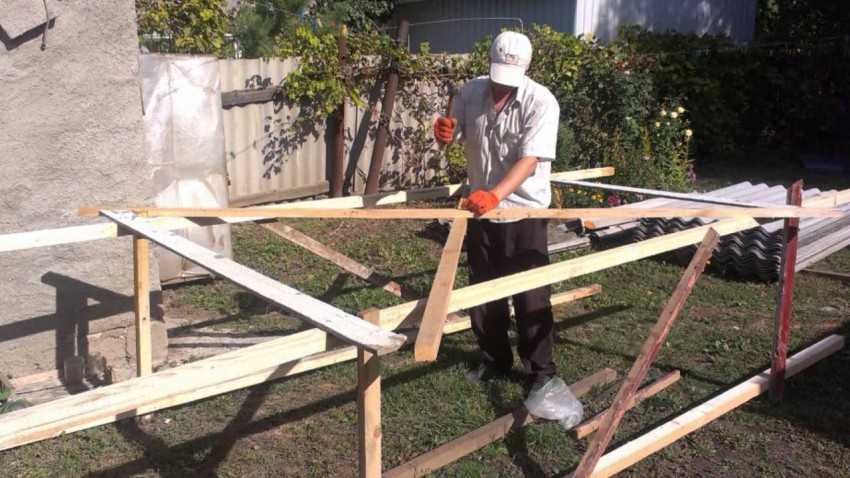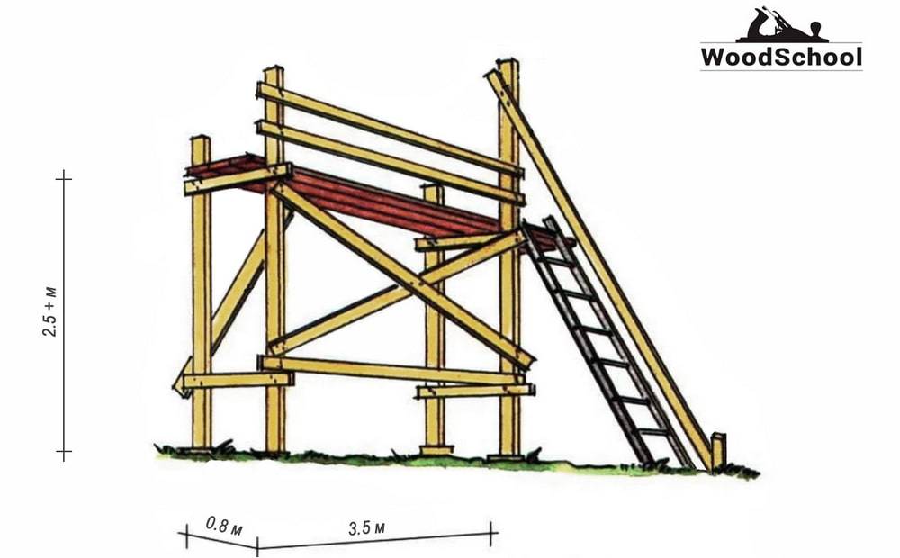 В частности, для создания каркаса выбирают цельный брус шириной не менее 10 см. Торцевые планки конструкции монтируют под острым углом. Две опорные шестиметровые балки укладываются в горизонтальное положение. Расстояние между ними составляет ширину будущих лесов. Рядом на одинаковом расстоянии укладываются еще две шестиметровые балки. Верхние концы балок должны сходиться под небольшим углом в виде трапеции, это придаст устойчивость будущим лесам.