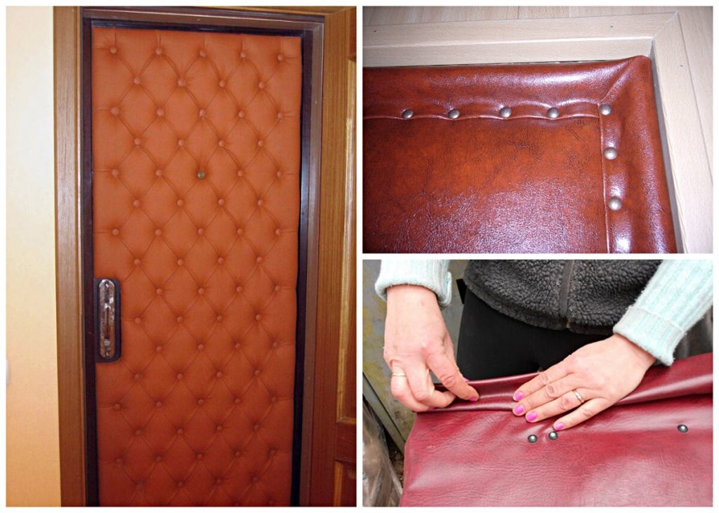 Поверх закрепленного утеплителя располагается накладка. Если при демонтаже она была повреждена, внутренняя панель меняется. После этого на место устанавливается глазок, ручки и запорные элементы, створка навешивается на петли.