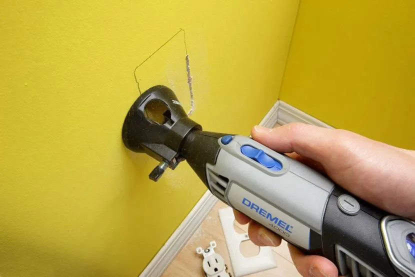 Вариант второй. Электродрель с цилиндрической насадкой позволяет создавать в гипсокартоне ровные кружки малого диаметра. Окружность тут не размечают, а ограничиваются пометкой в нужной области.