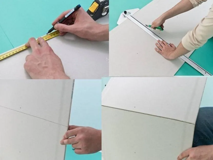 Краткий процесс резки гипсокартона выглядит следующим образом. Сначала осуществляется резка гипсокартона, после надлом. Также простой состав гипсокартона легко поддаётся сверлению, что необходимо для проделывания различных отверстий.