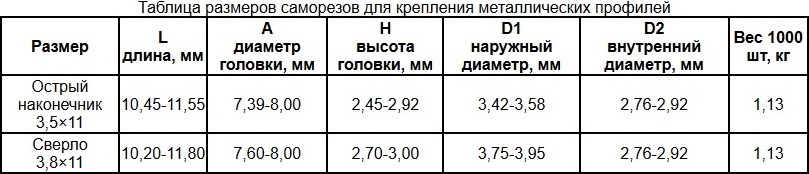 Для работы с металлом используются саморезы с номинальным диаметром от 3,5 до 5 мм. Их технические характеристики представлены в таблице 2.
