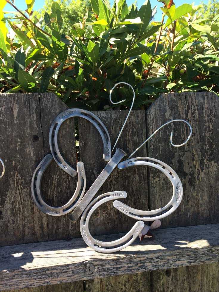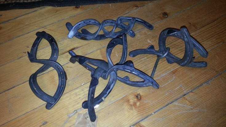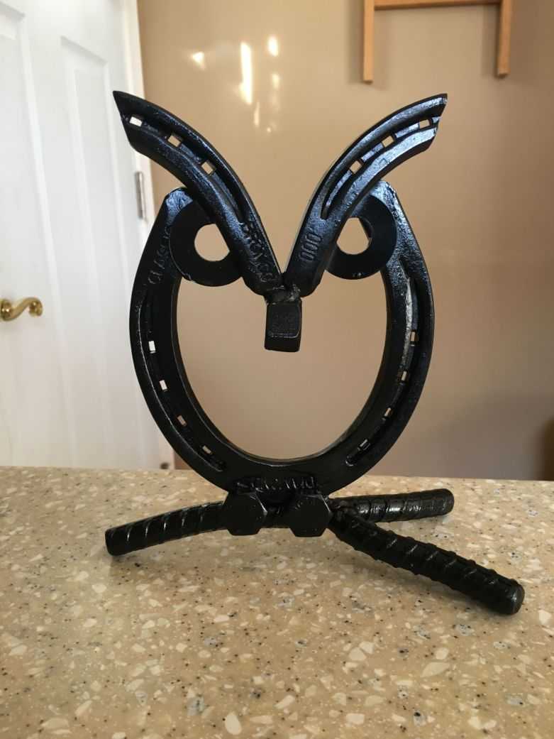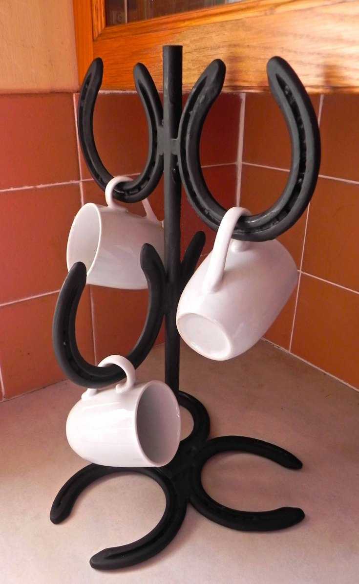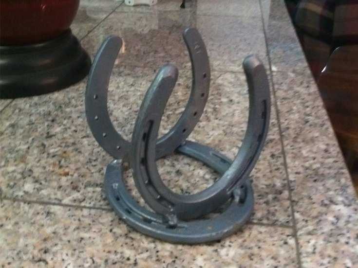 Подставка из подков делается следующим образом. Берутся две подковы, поворачиваются обратной стороной и привариваются между собой. Производится ещё такая же пара объединённых подков.