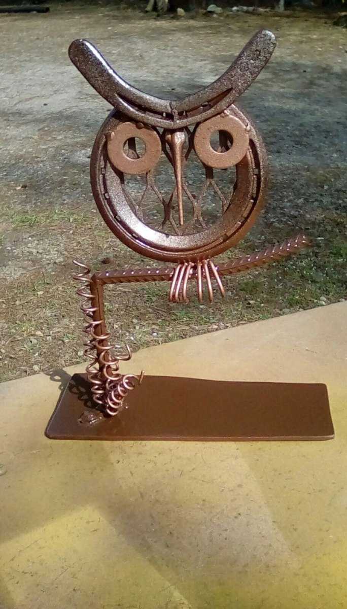 Создавая глаза для совы, позаботьтесь о том, чтобы в них были сделаны большие отверстия, в которые можно будет вставить болты. На всех чешуйках вам придется создать насечки, благодаря которым будет обеспечен эффект оперения. Для этого вам придется воспользоваться зубилом. Лапы можно сделать путем соединения частей прута друг с другом, используя для этого сварку. Для создания клюва используют кусок согнутого металла. Во время сборки изделия клюв и лапы необходимо приваривать в самом конце. Когда все элементы окажутся на своем месте, сову можно дополнительно украсить, обработав ее специальным лаком.