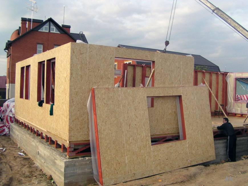 Основа подобных зданий – каркас из дерева или металла. Он включает в себя стойки, обвязочные и прочие элементы. Внутри стен кладется утеплитель, а с двух сторон всё это обшивается плотными листами ДСП или ОСП. Стена такого дома весит в 15 раз меньше кирпичной.