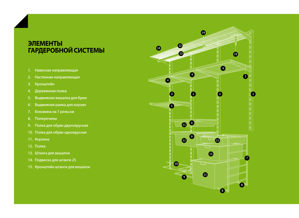 Кронштейн | Этот элемент устанавливается в специальные пазы в стойках или рельсах. На него крепятся полки, корзины, ящики и прочие элементы гардеробной. |