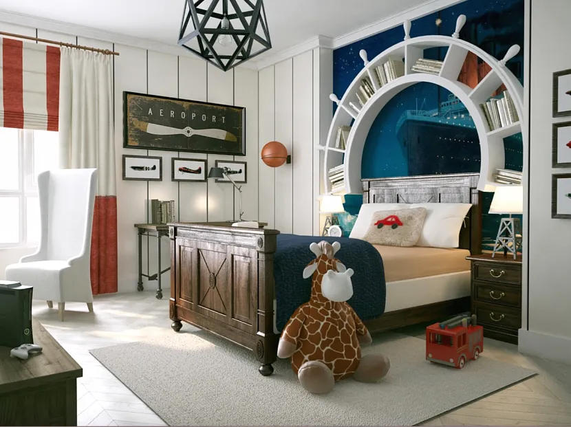Для потолка припасены более разнообразные варианты отделки. Все зависит от изначальной концепции. Если придерживаться легкой морской тематики, где хочется провести простой ассоциативный ряд с побережьем, потолок можно оставить белым, чтобы не ограничивать пространство. Но стоит применить немного фантазии и представить, что комната стала корабельной каютой, и потолок уже отделывается деревом, словно на настоящем корабле. А тот факт, что он стал немного ниже, только сыграет на руку, ведь на корабле для матросов отведено не так-то много места! В таком случае, потолок может быть любого древесного оттенка.