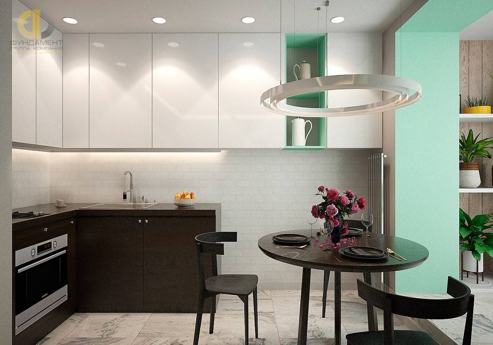 Работая над проектом кухни в квартире на Пятницкой, дизайнеры ГК «Фундамент» придумали неординарный ход и доверили роль цветового акцента открытому мебельному модулю. Несмотря на достаточно нейтральный оттенок бирюзы, в который выкрашен этот подвесной элемент, на контрасте с мебелью белого цвета и венге он выглядит достаточно ярко. А отсутствие фасада позволяет использовать его как витрину для красивой посуды или аксессуаров.