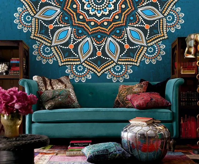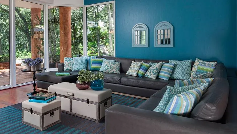 Гардины, мягкая мебель, декоративные подушки, светильники – все это может иметь разные оттенки бирюзы, соединяясь с подобными и контрастными цветами в причудливых узорах.