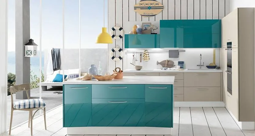 Для тех, кто не любит диктата крикливых или безликости нейтральных расцветок на кухне, морская палитра – оптимальный вариант. Сочетания оттенков циана с натуральным деревом наполняют помещения уютом. Яркие цвета – розовый, желтый, красный – привносят жизнерадостную энергию.