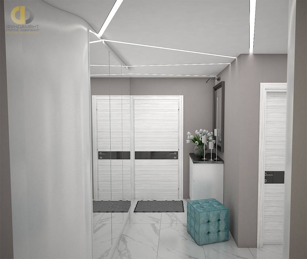 Оформленный декоративными пуговицами пуф-куб – подходящая акцентная деталь для монохромного интерьера коридора в серых тонах в ЖК «Красная Горка». На таком лаконичном фоне он выглядит очень выразительно. А его велюровая фактурная обивка удачно контрастирует с гладко оштукатуренными стенами, зеркальными фасадами большого гардеробного шкафа и белым мраморным полом.