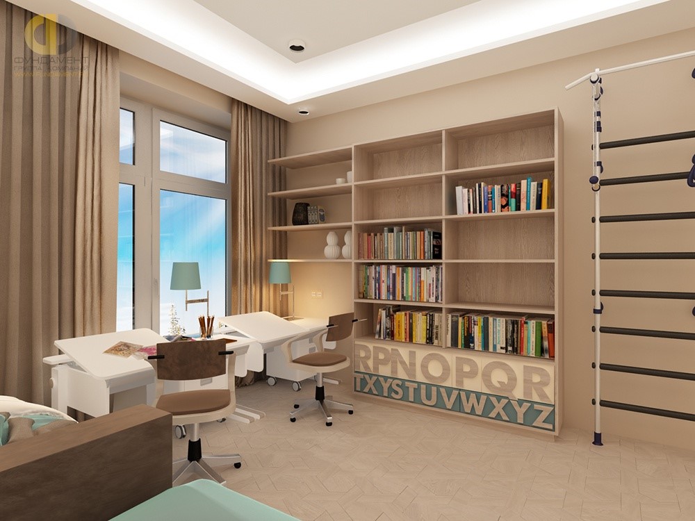 Лаконичный интерьер детской комнаты в приятных бежевых тонах – благодатная почва для неброских акцентов в разбеленной бирюзовой гамме. Это могут быть настольные лампы или торшеры с абажурами спокойного ментолового оттенка, покрывала на кроватях или декор на фасадах книжного шкафа.