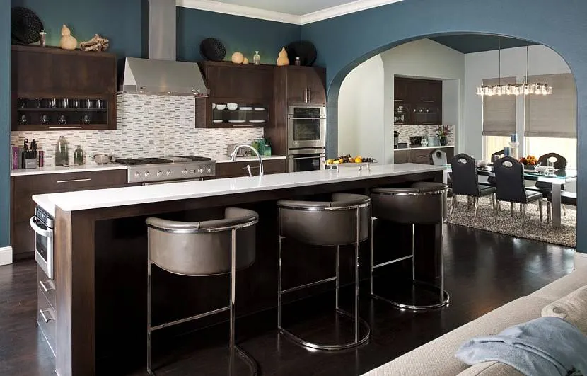 Текстильный декор незаменим, когда нужно расставить цветовые акценты в интерьере кухни-гостиной. Кроме традиционных декоративных подушек в бирюзовых чехлах и подходящей по цвету мебельной обивки для этой комнаты можно подобрать соответствующие шторы и цвет отделки стен.