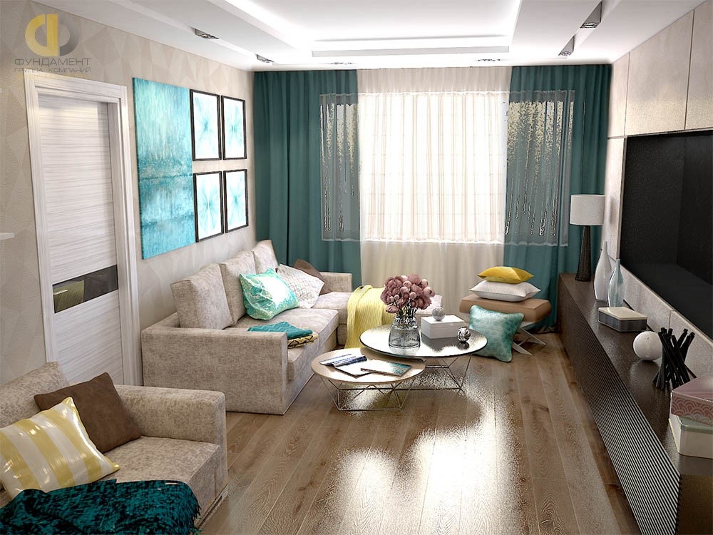 Бирюзовый цвет в интерьере гостиной на фото, оформленной в светлой цветовой гамме, представлен в виде эффектных акцентных деталей: картин в современном стиле, декоративных подушек, пледов, штор. Они делают обстановку ярче, но не доминируют в пространстве. А при желании их можно без серьезных затрат заменить декором в другой колористике, и комната будет восприниматься совершенно по-иному.