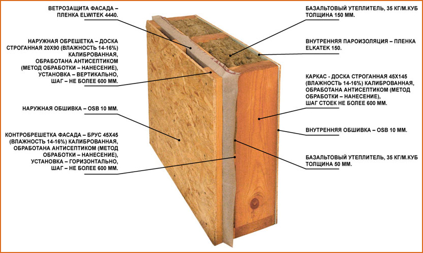 С наружной стороны крепится листовой материал по всей площади стен. Внутри крепится паро защитный нетканый материал, между стойками крепится утеплитель. Поверх утеплителя опять парозащита. Далее, внутренняя обшивка из листового материала.