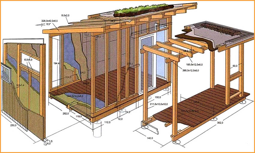 Для такого небольшого домика основным материалом будет выступать брус 50х50 мм. Из него будет возводиться каркас здания, каркас внутренних перегородок и стропильная система.