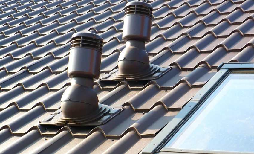 На скатной крыше мастера советуют ставить выход вентиляции максимально близко к коньку. Это обеспечивает равномерность прогрева внутренней части. Еще гарантирует прочность внешних деталей