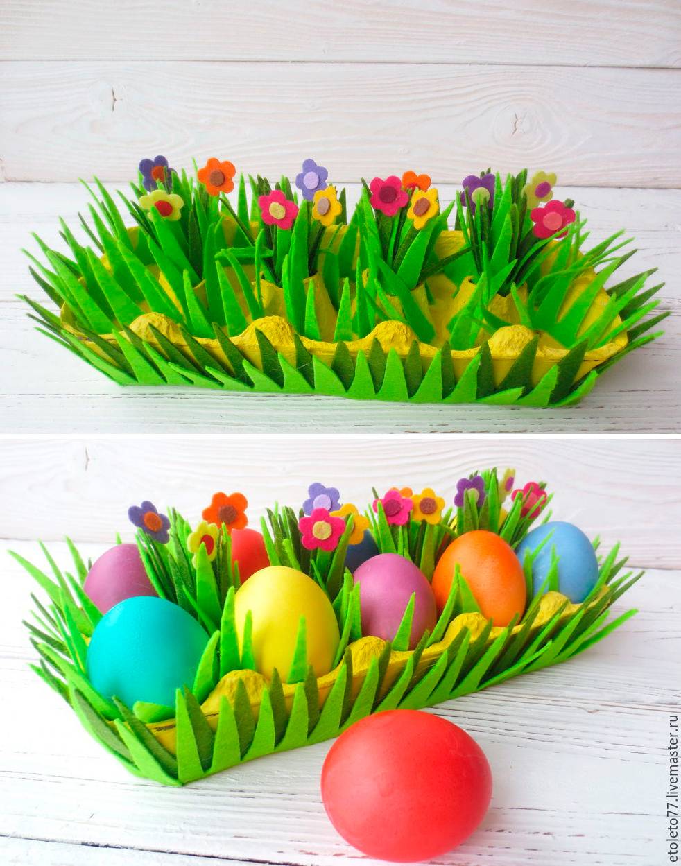Для изготовления такой чудесной поделочки из лотка для яиц, нам понадобятся кусочки фетра разных оттенков, краски, клей, ножницы и крашеные яйца для заполнения.