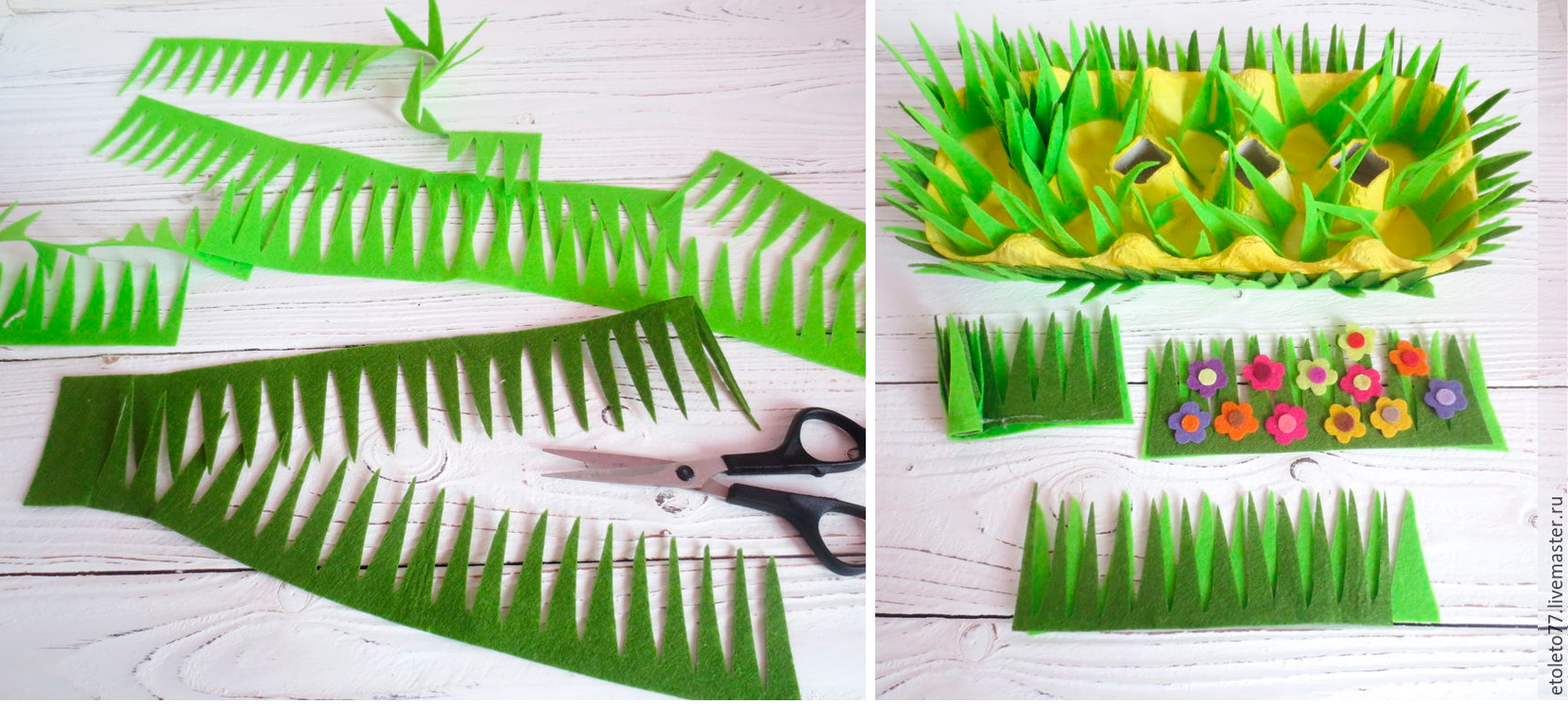 Шаг 2. Берем фетр толщиной 1 мм и нарезаем полоски травкой. Высота травки примерно 5-6 см. Лучше будет смотреться, если вы возьмете зеленый цвет в двух оттенках (светлее и темнее). Декорируем лоток, фиксируя фетр клеем.