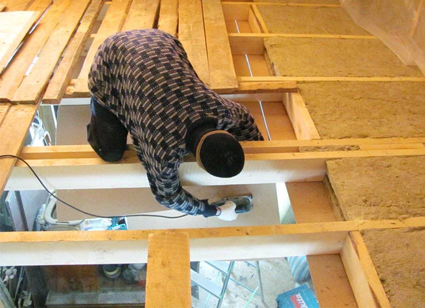 Подшивка из досок толщиной 2-2,5 см. По подшивке делается смазка, поверх которой укладывается слой изоляции. Снизу доски покрывают мокрой или сухой штукатуркой. Возможна подшивка чистой доской под проолифку с укладкой по подшивке пергамина или правовая школа: толя, прибиваемого мелкими гвоздями, с последующей укладкой легкого звукоизоляционного утеплителя.